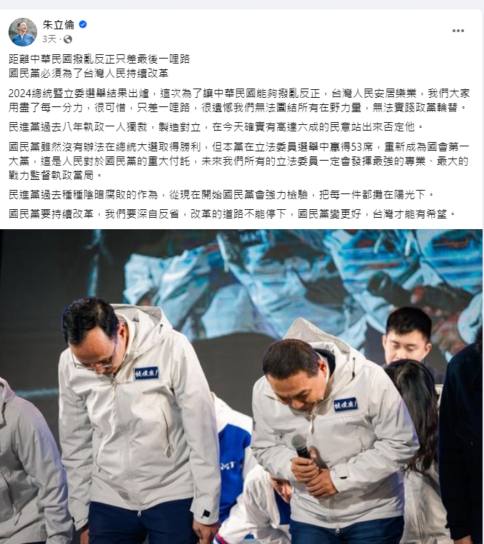 選後,朱立倫在臉書說,「距離中華民國撥亂反正只差最後一哩路,國民黨必須為了台灣人民持續改革」。又說,「國民黨要持續改革,我們要深自反省,改革的道路不能停下,國民黨變更好,台灣才能有希望。」大有非我其誰的味道,從頭到尾都沒有提到自我反省、更甚是要辭職的意思。
