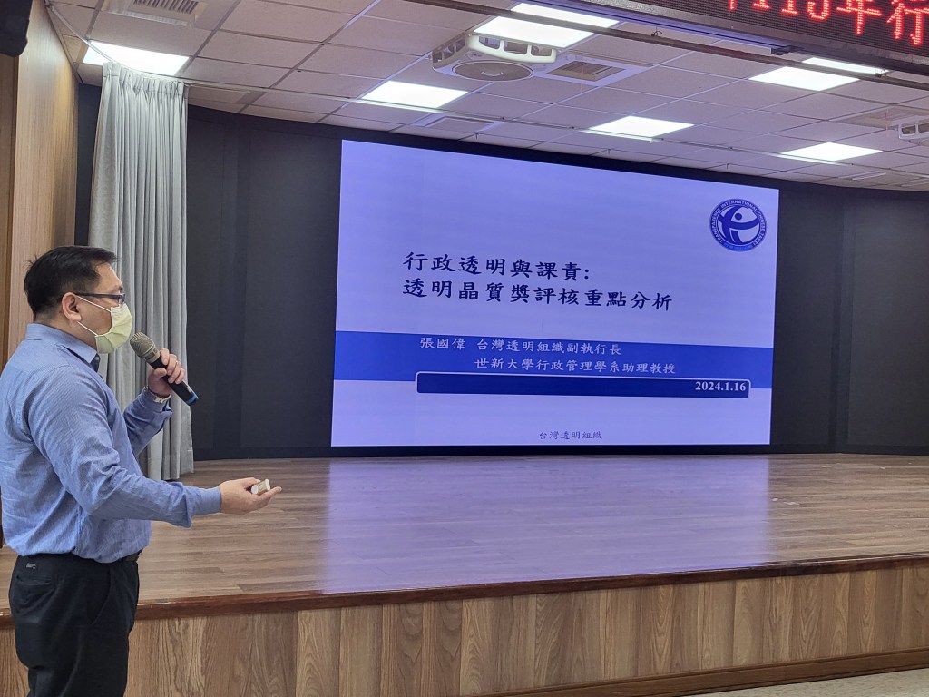 「透明晶質獎」源自2018年聯合國反貪腐公約首次國家報告國際審查會議結論性意見,而為回應臺灣民眾對於社會公平正義及廉能透明政府的殷切期盼,於是法務部辦理廉潔評獎;張國偉教授曾任法務部廉政署「透明晶質獎」試評獎評審委員,學術及實務經驗豐富,他鉅細靡遺說明評核要項的具體功能,將機關廉政成效及創新作為,依評核構面具體逐一執行項目,必能非常有效掌握為民服務績效以外,更能提升公務員公開客觀的圓滿服務。