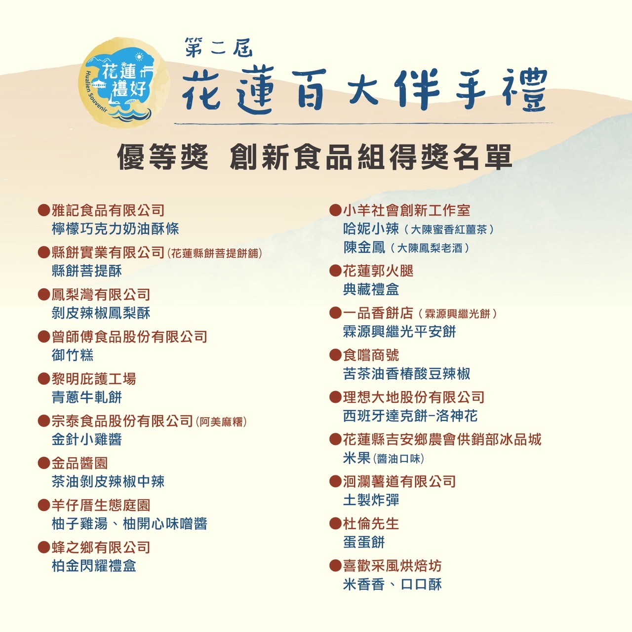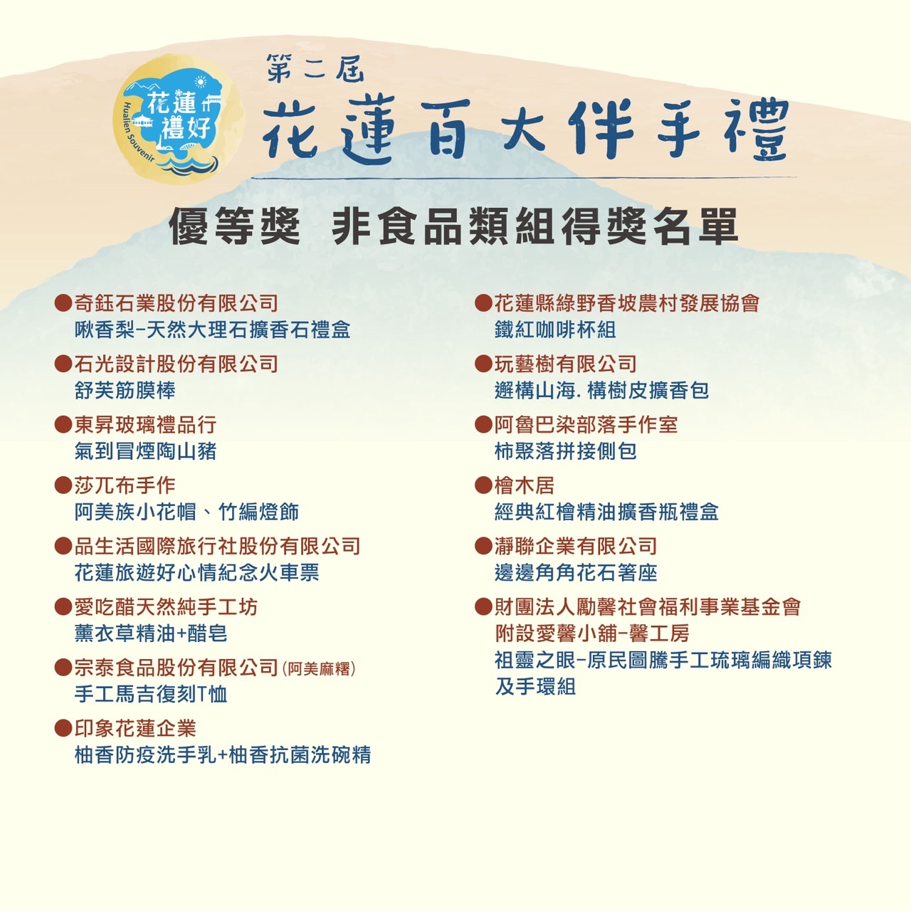 更多優等獎得獎名單與最新活動資訊,歡迎大家搜尋花蓮百大伴手禮官方網站:https://hualiengift.shop/ 與官方臉書粉絲團:花蓮縣百大伴手禮 https://reurl.cc/V4yQkQ