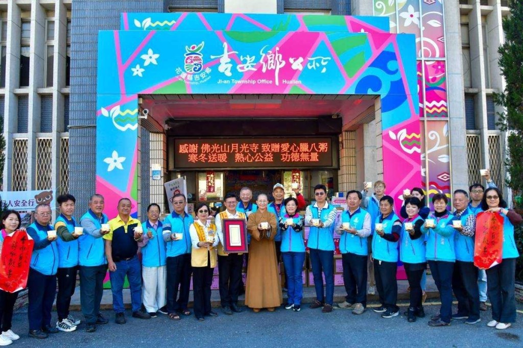「福慧共享、法喜同慶」慶祝佛陀成道紀念日,佛光山月光寺妙勳法師及師兄姊們,親自將千餘份細心熬煮的臘八粥送至鄉公所大門前,由各村村長、志工們協助分送至部落及弱勢家庭,傳遞歲末溫暖關懷與祝福!鄉長游淑貞親頒感謝狀,感謝寺方十餘年來共力吉安鄉的照顧,同時希望這一份滋補暖心的臘八粥,為大家帶來平安滿溢的幸福味,更祈祝新的一年闔家安康。