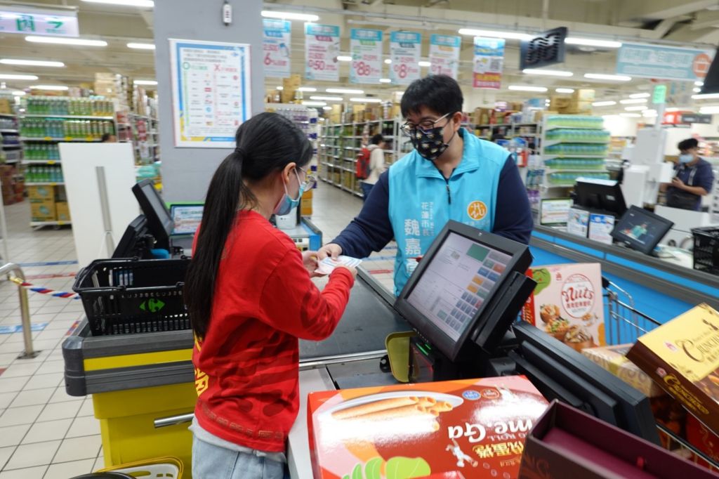 花蓮市公所愛心禮券將於22日起發放,花蓮市1300餘戶將受惠。為讓收到禮券的市民朋友了解如何採購,市長魏嘉彥今天在社勞課蕭子蔚的陪同下,前往家樂福量販花蓮店,為關懷戶提供採買的要訣。