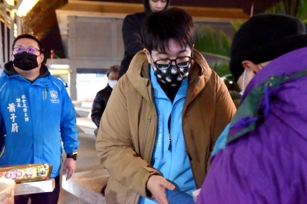 入冬以來最強寒流來襲,全台發布低溫特報,從周二起溫度急遽下降,夜間更下探個位數低溫;市公所特地啟動「暖心專案」,魏嘉彥市長趁著夜晚,送熱食及保暖物資給火車站周遭活動的街友,並呼籲他們要好好照顧自己,將之前送來的保暖物資穿上,並趕快喝下熱粥祛寒,他也籲請市民如果週遭有需要協助的個案請立即通報市公所,也可以多加利用愛花蓮實物銀行的物資。