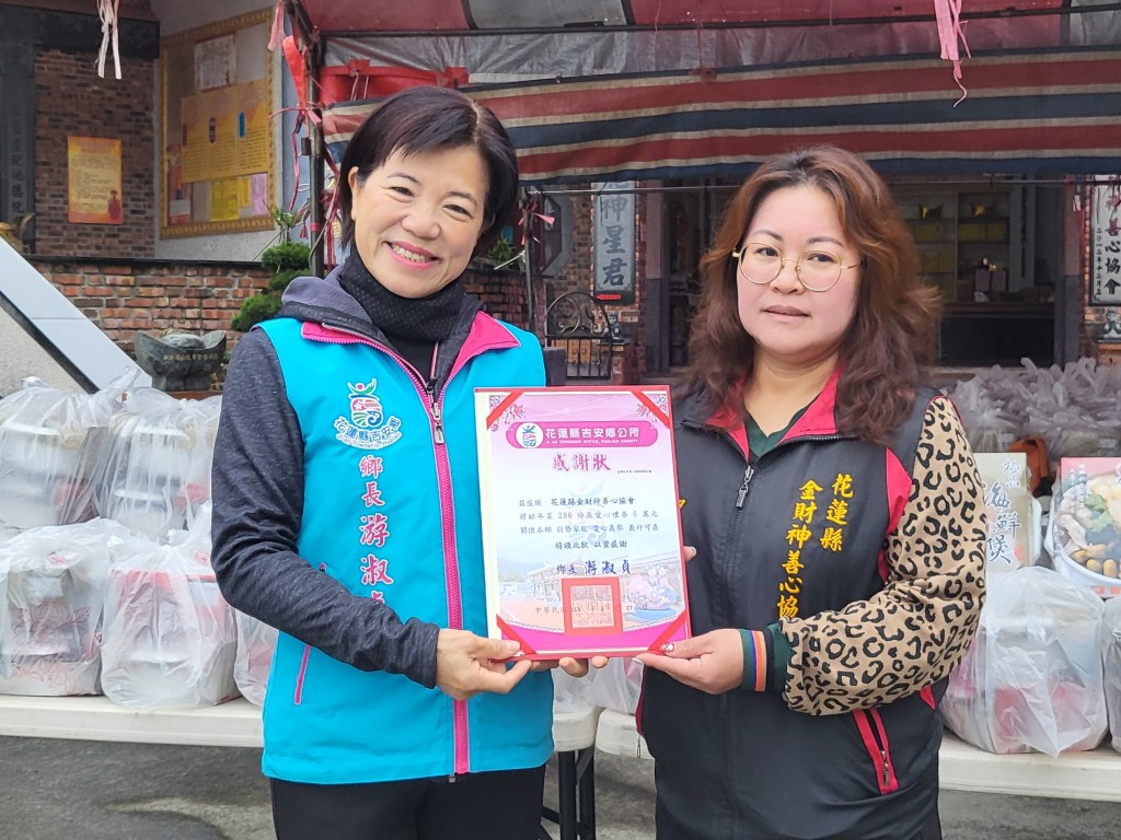 花蓮縣金財神善心協會於昨27日,在金財神寶殿前發放200份暖心年菜及購物禮券達十萬元,嘉惠吉安鄉南華、福興、稻香、干城、吉安、慶豐、永興及南昌等八村的中低收入戶長者,鄉長游淑貞陪同該協會理事長李秀霞逐一親送購物禮券和豐富年菜,更加碼吉安鄉限量應景龍年開運福袋,也代表鄉親頒發感謝狀,感謝在地宮廟牽起源源不斷的社會愛,帶給弱勢家戶長者滿滿的祝福,祈願新的一年…平安健康!好運龍總來!