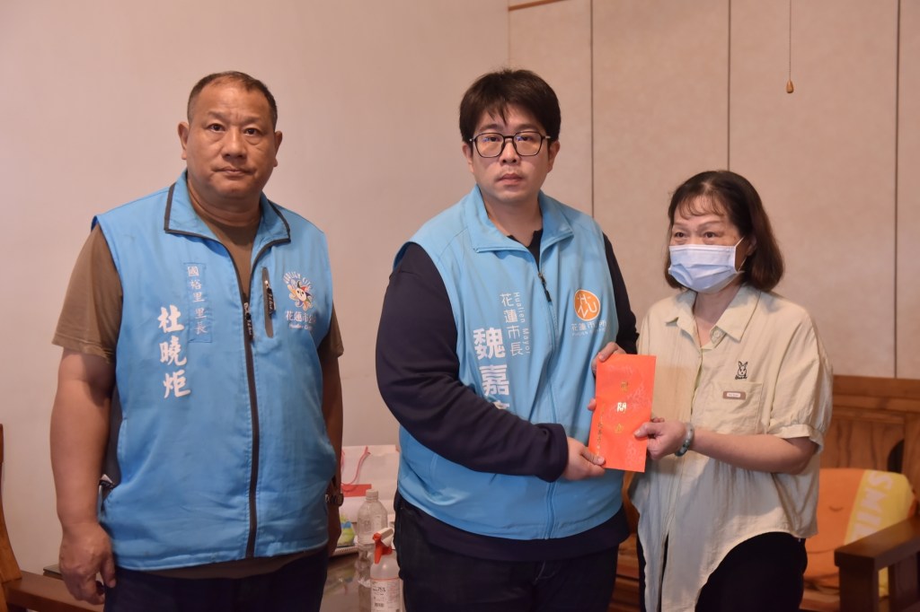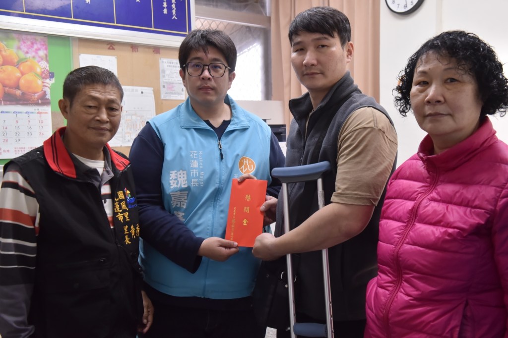 花蓮市長魏嘉彥日前偕同社勞課長蕭子蔚,在黃秀霖及杜曉炬二位里長的陪同下,先後前往國風里及國裕里探視兩位因車禍導致無法工作的案主,魏嘉彥除叮嚀他們靜心休養之外也發給急難紓困金助他們暫度難關,並指示社勞課同仁協助轉介民間資源、基金會來作長期的關懷協助。