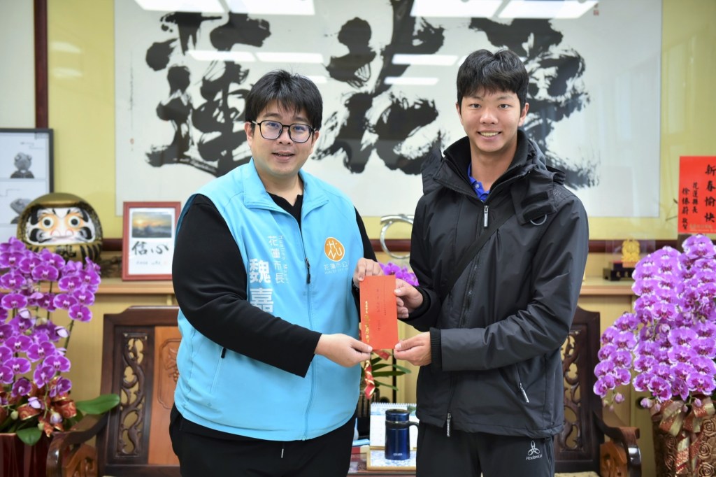 魏市長恭喜楊同學在全國賽事中得到好成績,他表示,每一次的練習和比賽,都會成為選手們進步與成長的養分,每一面獎牌的背後,更是選手們風吹日曬、不斷苦練而淬煉出的成果,希望這份獎勵金能帶給熱愛運動的選手實質的鼓勵與肯定,也期盼大家能多加關注各項運動賽事,給予體育選手支持與應援,市公所將持續辦理各類型的競賽,發掘有潛力的人才,並成為花蓮選手的堅實後盾。