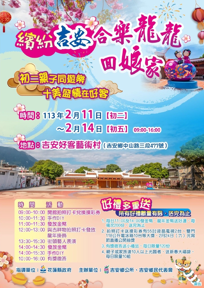 吉安鄉於2月14日前,歡迎大家前往哈囉廣場與親子龍花燈合影、或到鄉內各步道、景點走春拍照打卡,都可在好客藝術村憑合影照片領取摸彩券、參加摸彩,有機會將兩台55吋電視機、十台118公升雙門電冰箱帶回家,同時,鄉公所也準備十美盛情精采好禮送給大家,詳情請參閱吉安鄉公所官網或好客藝術村臉書粉絲專頁(https://www.facebook.com/JianHakka)。