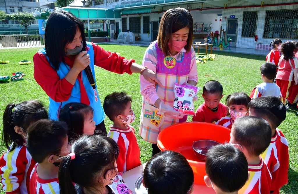 緊接滾元宵DIY接續上場,在師長從旁協助下,孩子們搓圓紅豆內餡、再為圓滾滾的餡料「洗澡(泡水)」、撈起放入鋪滿糯米粉的容器內,然後一雙雙小手抓著容器邊緣小心搖晃,當看到裹上糯米粉的內餡隨著一次次重複泡水、撈起、滾動裹粉的步驟慢慢地變胖變大顆,小朋友們忍不住驚喜呼喊:「哇!變大顆了!」、「老師,我們可以讓元宵再變大顆一點喔!」。