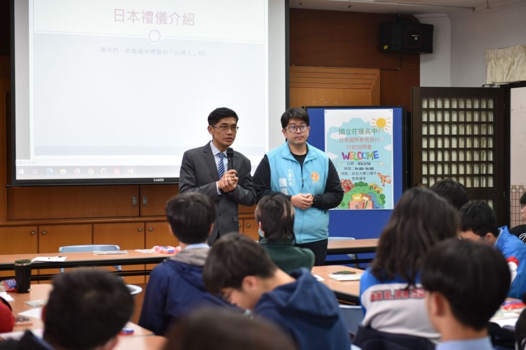 花蓮高中校長楊鵬耀表示,自2020年起,在本校英文科教師麥芃芃及不來方高校英文科教師松尾美幸的努力下,國際教育旅行社的成員克服疫情,持續與日方學生進行視訊互動,透過介紹兩地的美景及美食等,認識雙方文化及語言並聯繫感情。他說,學生們在行前的培訓課程中,已學習日本的語言、參拜方式、和服及禮儀文化,相信這次的實質交流,能為彼此的學習生涯留下難忘回憶。