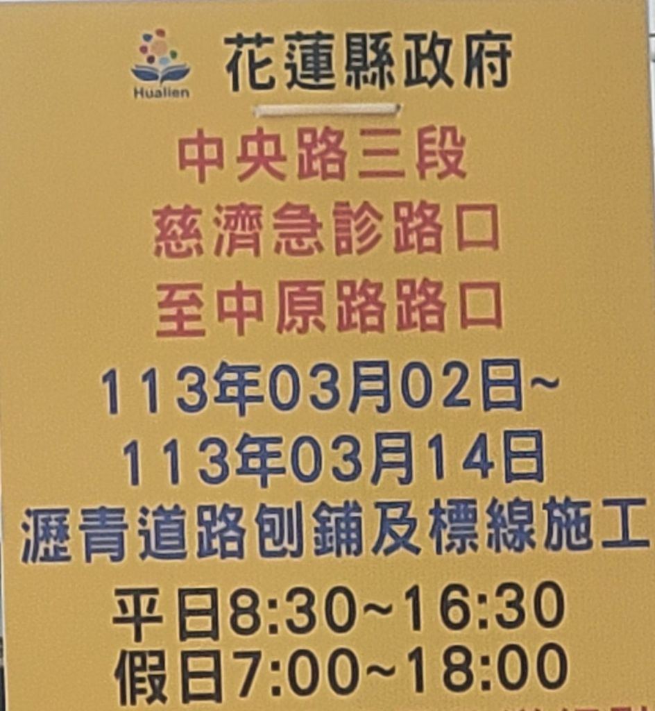 花蓮縣政府為改善中央路三段道路鋪面及標線品質,編列預算辦理「中央路瀝青混凝土鋪設工程(中原路口至慈濟醫院出入口)」,預計於113年3月2日自慈濟醫院前採調撥車道方式辦理施工,預計工期為14日曆天,將全面改善中央路(花蓮市中山路至吉安鄉中原路間)之道路鋪面平坦度,工程經費為3,420萬元,請用路人體諒提前繞道並減速慢行。