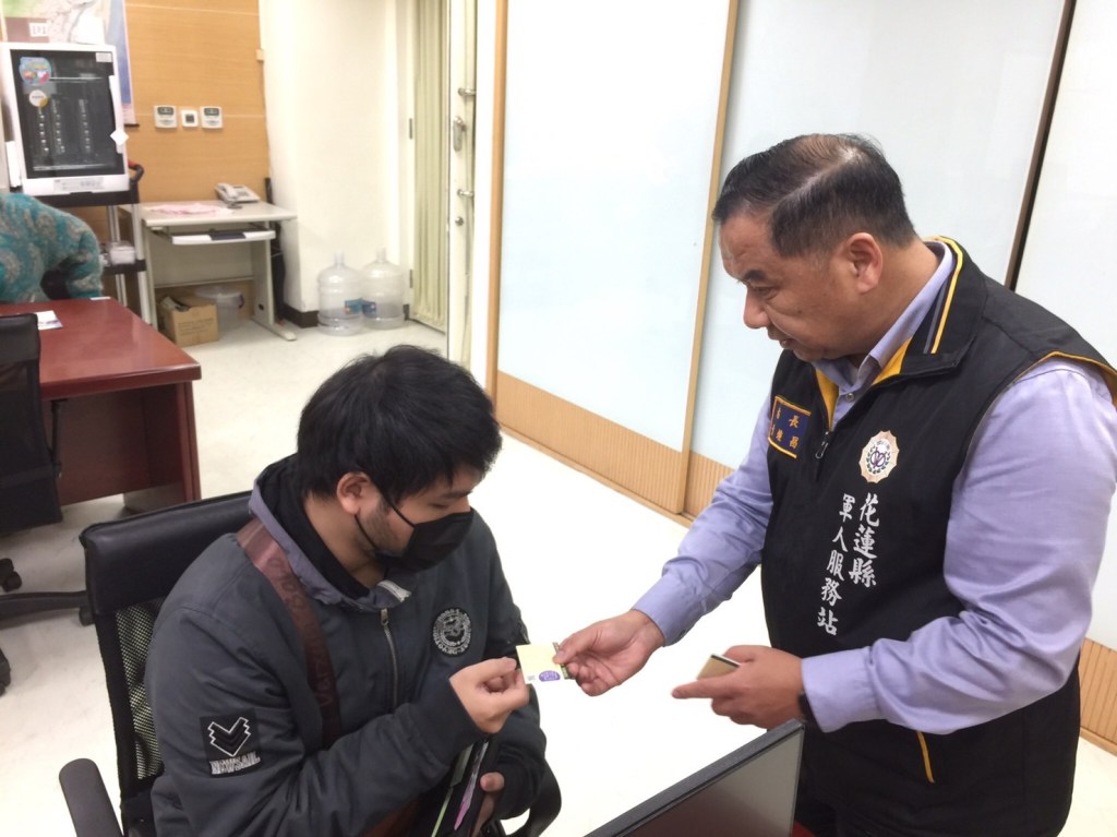 在各場次抽籤作業直前,由花蓮縣軍人服務站站長黃鍾昌發放「軍友服務卡」及名片,並提醒準備抽籤之役男有任何兵役問題可隨時向軍人服務站洽詢。
