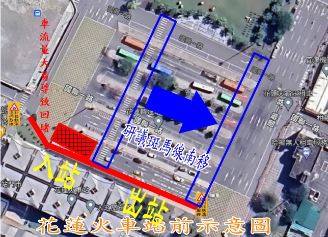 另警察局在啟用執法設備前,於113年1月17日再次與路權單位共同會勘站區周邊交通工程,其中「行人穿越道標線往南移(繪)設」部分,因涉及火車站站前行人整體動線,經會同相關路權單位現勘,目前行人穿越線設置地點對行人動線並無安全上之疑慮,爰決議不調整移設,後續將持續觀察做滾動式檢討;另「花蓮火車站第6車道開放車道作為迴轉道使用」一節,因考量車輛自迴轉車道橫越國聯4路車道銜接國興1街,易造成車輛動線交織徒增事故風險,爰維持於連假期間國聯4路車道設有阻隔器材情況下,開放該車道供自小客車停車及順向通行,不供作迴轉使用。