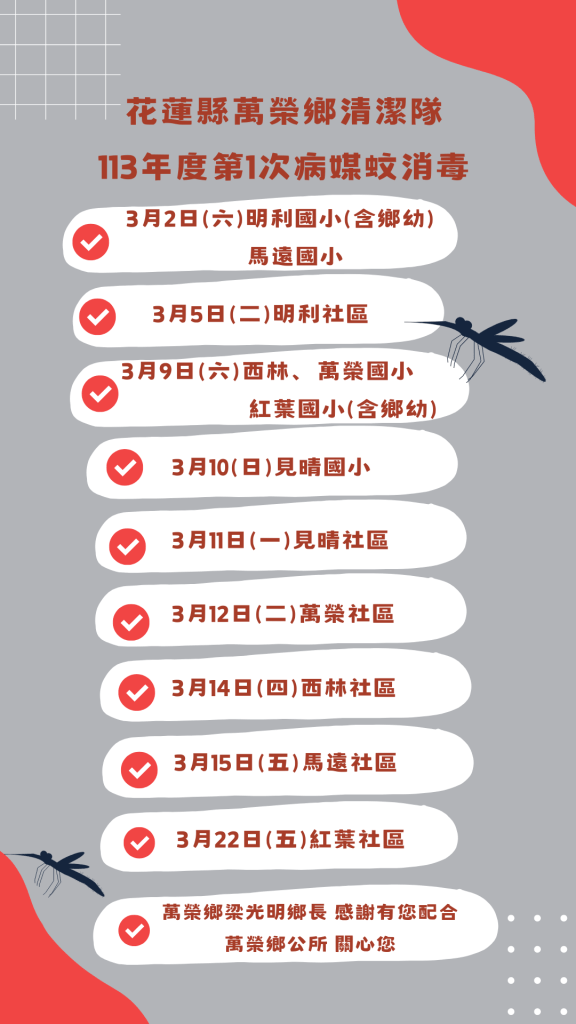 夏季為登革熱好發期,為避免病媒蚊孳生,萬榮鄉公所清潔隊於3月2日起,展開113年度第1次全鄉社區及國小病媒蚊消毒作業,鄉長梁光明提醒村民,預防登革熱之環境衛生用藥,雖經稀釋調配後對人體無害,但仍請配合提前緊閉門窗、收起戶外衣服和食物,並將寵物或家禽移至適當處所,同時將水溝蓋上雜物清除,以利工作人員作業,上述事項敬請村民多加留意與配合。