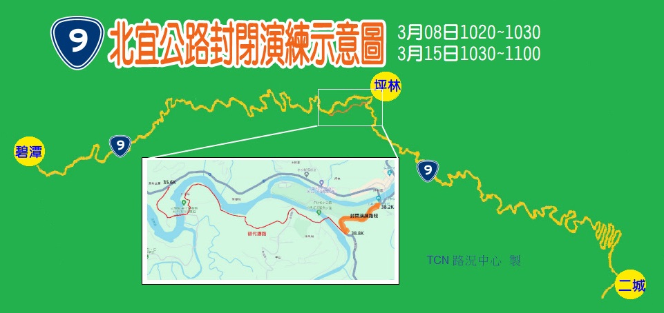 公路局北區養護工程分局為辦理汛期前道路防災演練,封閉台9線38.2k~38.8k雙向車道,民眾可自38.8k改行替代道路由魚堀路沿金瓜寮溪至35.6k,或於兩端封閉處稍候待演練結束,預計封閉時間為113年3月8日(星期五)上午10時20分~10時30分及111年3月15日(星期五)上午10時30分~11時。