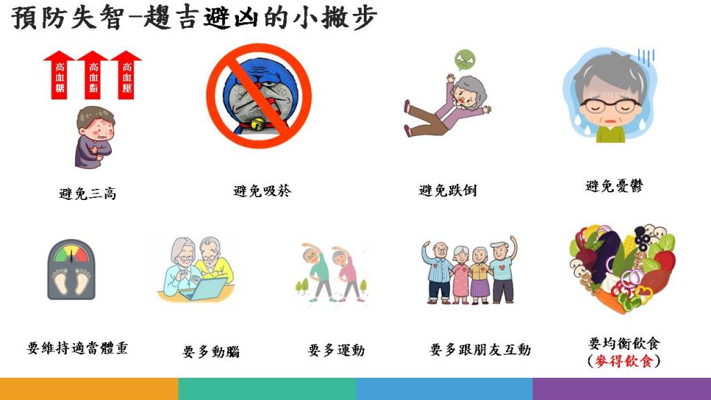 要預防失智症,在此建議要多選擇原型食物,盡量避免加工食品及精緻食物,多食用彩虹蔬果、多白肉(魚、雞、植物性蛋白及其製品)、少紅肉,選擇好油及適量堅果,符合少油、少鹽、少糖的健康烹調方式,遵循麥得飲食原則,有助於遠離失智症。