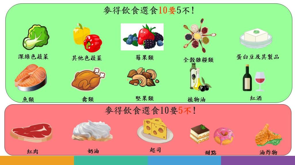 另外麥得飲食建議盡量避免紅肉、奶油、起司、甜點及油炸物等五種食物。