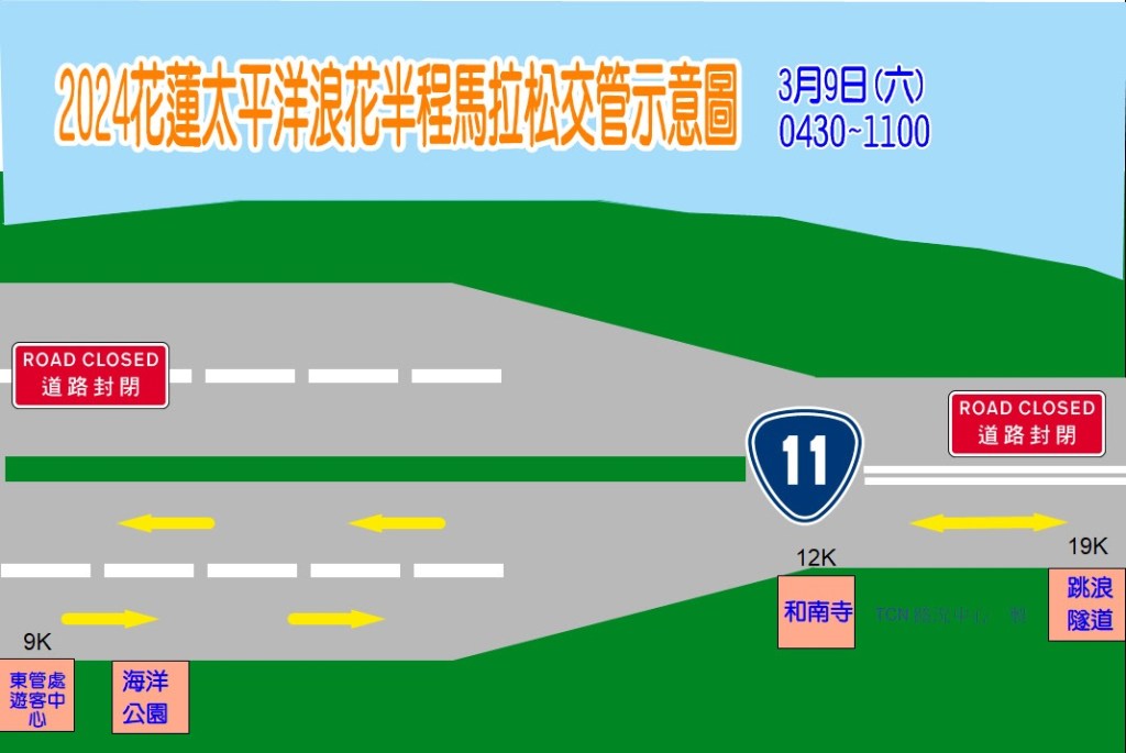 花蓮縣體育會3月9日(星期六)上午4時30分至11時舉辦「2024花蓮太平洋浪花半程馬拉松」,台11線9k+152至19k將於活動期間採分段管制,東海岸管理處遊客中心(9k)處至和南寺(12k)處,北上車道封閉,南下車道調撥雙向通行;和南寺(12k)處至跳浪隧道北端(19k)處,北上車道封閉,南下車道供單線雙向通行。