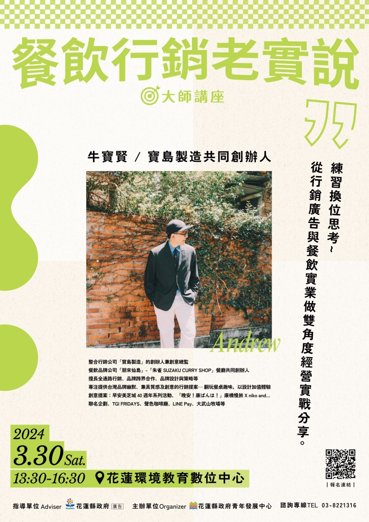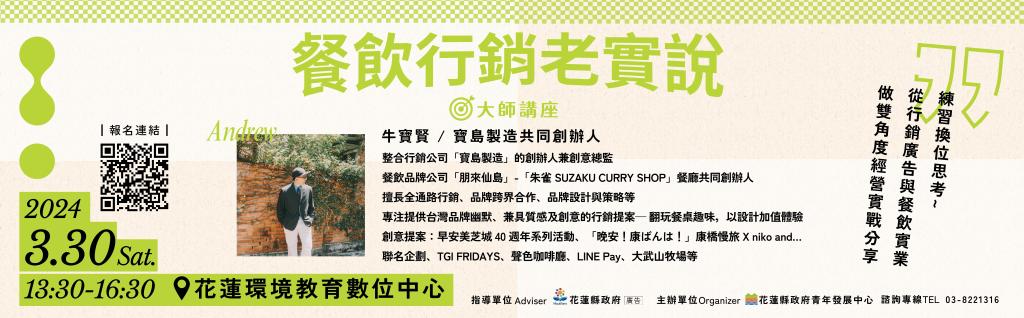 花蓮縣政府青年發展中心「大師講座」系列講座3月30日下午1時30分於花蓮環境教育數位中心開設「餐飲行銷老實說」課程,邀請寶島製造共同創辦人牛寶賢,帶領民眾換位思考,從行銷廣告與餐飲實業分享雙角度經營實戰,歡迎踴躍參加,課程免費報名網址:http://ydc.org.tw/course-inner.aspx?num=155