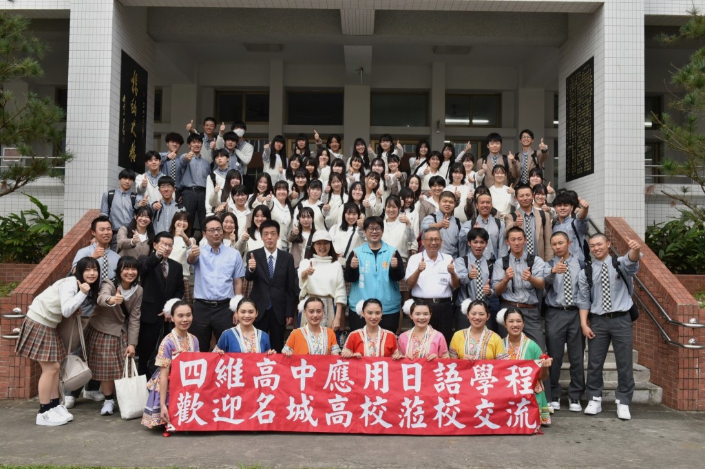 日本名古屋市名城高校學科長古沢寿博與師長紀藤雄一郎、伊藤高司一行66名師生遠道而來,受到四維高中董事長黃淑怡、校長蔡忠和及全體師生的熱烈歡迎,並以阿美七鳳迎賓舞,及甫榮獲全國特優的原舞社團和舞感社帶來精彩表演,隨後也安排烘焙與個性化商品的實作體驗課程,讓雙方藉由互動,加深對彼此的認識,而名城高校的學生也特別準備舞蹈才藝表演,臺日兩方各自展現出年輕世代的活力與熱情。