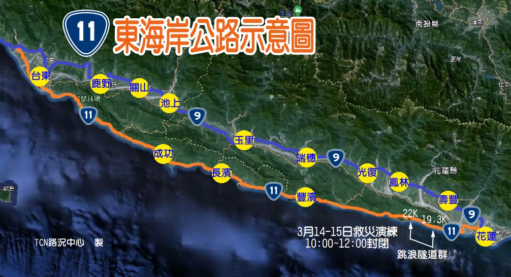 台11線跳浪隧道群防災演練封閉措施 發表於2024-03-11 由回添史撰寫 【TCN路況中心】綜合報導 3月14日、15日10時至12時實施113年汛前防救及隧道聯防救災演練,「台11線19k+300~22k+000(跳浪~水璉)」隧道群將實施道路(隧道)管制封閉,管制時段請用路人預作行程安排或調整行駛路線 分享此文: 按一下即可分享至 X(在新視窗中開啟) X 按一下以分享至 Facebook(在新視窗中開啟) Facebook 按一下以分享到 Telegram(在新視窗中開啟) Telegram 分享到 WhatsApp(在新視窗中開啟) WhatsApp 喜歡 正在載入... 相關