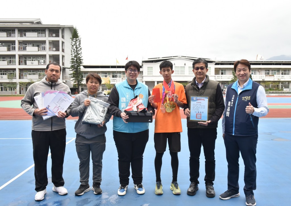 在校長許傳德、指導教練蕭雅云、體育老師林家福及縣議員魏嘉賢的見證下,市長魏嘉彥頒發獎狀予徐唯宸,並履行承諾贈送田徑運動服及運動鞋,以此獎勵他在田徑體育上的卓越表現,徐同學也露出羞澀笑容,脖子上掛滿征戰各賽事奪得的數面金牌,與魏市長合影留念。