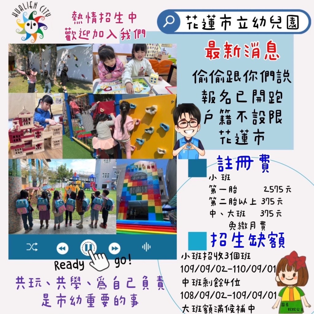 魏市長也提及,市立幼兒園新學年的招生已經開跑,報名戶籍不限花蓮市,大班目前額滿候補中,中班剩餘個位數名額,小班則還有三個班的名額開放報名,歡迎家長致電(03)8320245預約參觀,一同加入市立幼兒園的學習行列。