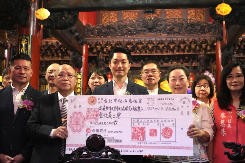 適逢媽祖聖誕千秋,臺北市松山慈祐宮昨(1)日舉行三獻大典祝壽,並在台北市長蔣萬安見證下,捐贈新台幣一千萬元給花蓮縣政府重大災害民間賑災捐款專戶,由花蓮縣長徐榛蔚親自代表受贈。出席與會貴賓還有財團法人台北市松山慈祐宮董事長陳玉峰、臺北市議會議長戴錫欽、臺北市議員秦慧珠、許淑華、張文潔、洪建益等人。