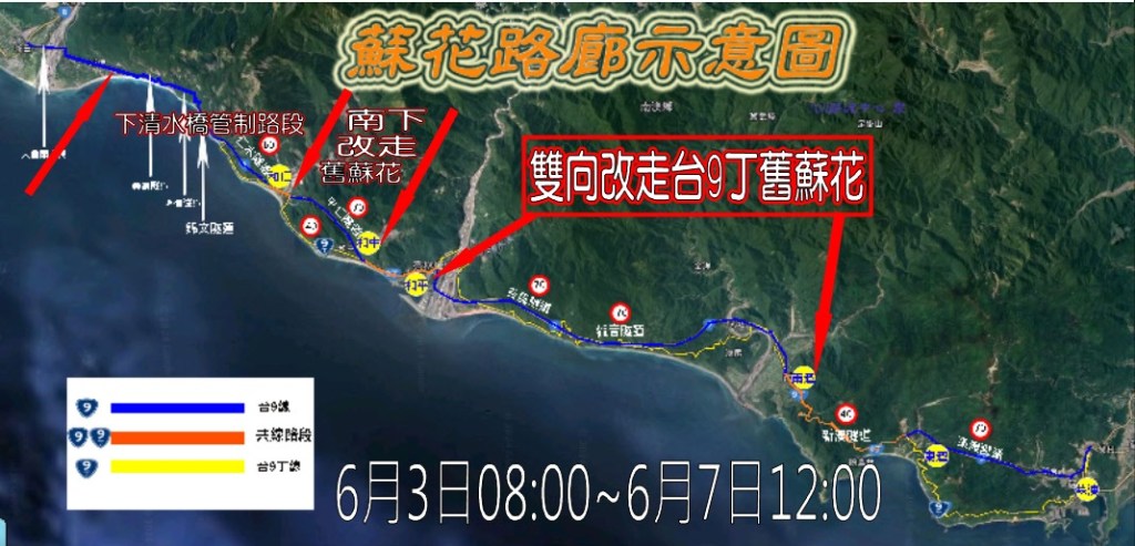 以上三項管制措施,個別看似乎覺得沒有多大的影響,但是如果以蘇花路廊路線全面性的連貫起來,下週勢必造成黑暗期。本報簡略的指引讀者蘇花路廊怎麼走: