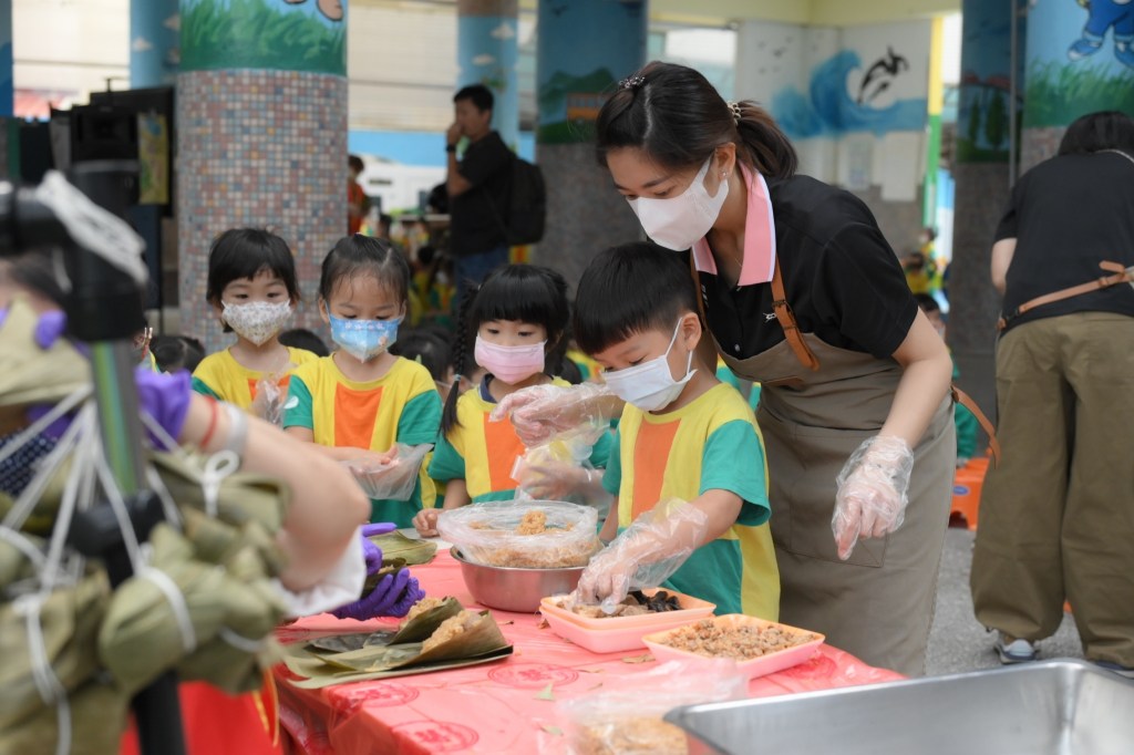 園內也傳來陣陣粽香,市長哥哥與小朋友們體驗包粽,依序放入糯米、香菇、瘦肉等食材,再將粽葉包起來,綁成一串串的粽子,除了傳統口味的肉粽,現場更準備了不一樣的口味內餡,包成香甜可口的水果粽,完成後大家都露出新奇的表情,說要帶回家和爸爸媽媽分享。