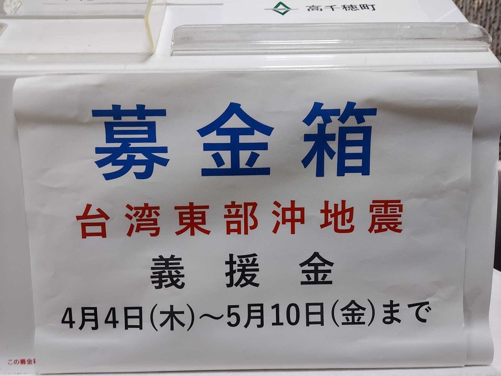 高千穂町町長甲斐宗之、議長坂本弘明、觀光協會長竹尾通洋及高千穂日華親善協會長佐藤哲章等人,日前至日本福岡辦事處,將募集到的捐款445萬1055日圓,連同關心的信件、千羽鶴以及為花蓮打氣的光碟,親手交給福岡辦事處長陳銘俊,由這些心意物品之後將由陳處長轉達寄送至花蓮市公所。