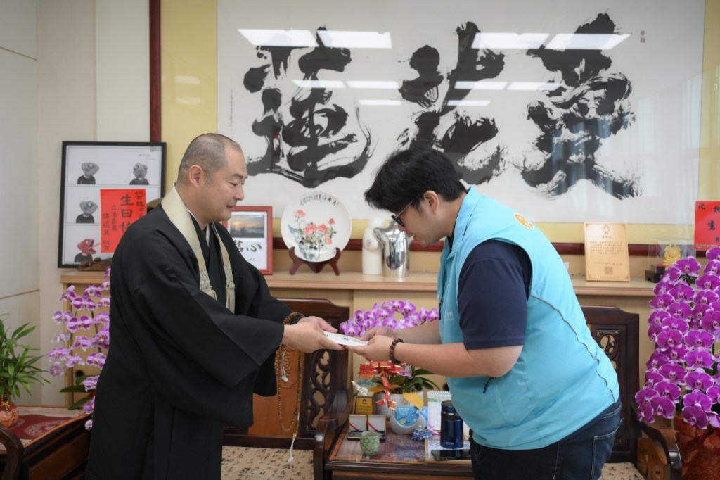 來自日本高野山真言宗,無量山的豐田真彰師父17日上午拜訪花蓮市公所,帶來募集到的善款以及一只護摩祈願札,希望能保佑、振興花蓮,祝福大家都能祥和安樂,無災無害。