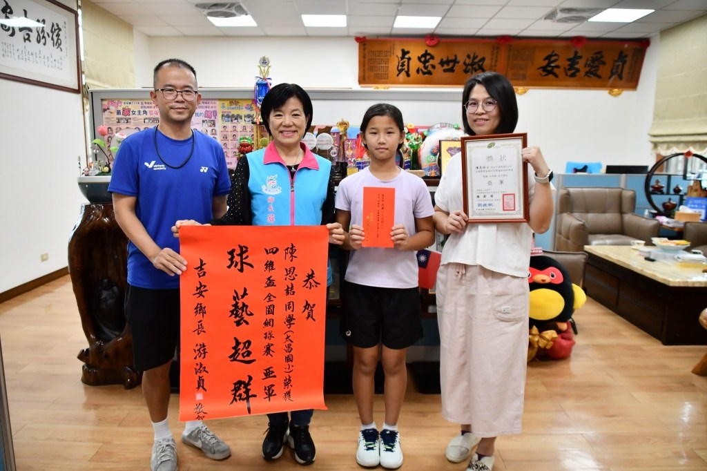恩喆爸爸說,她從幼稚園中班開始就對網球有著濃厚的興趣,看著小小的身軀賣力的跟著爸爸揮舞球拍,越是吃力恩喆的毅力就越強,每天放學後、假日時間,都不間斷的跟著爸爸重複練習從不懈怠,爸爸全心全力的陪伴,也成為恩喆克服挫折艱辛的力量。陳爸爸非常感謝游淑貞鄉長用如同爸媽般的愛與關懷鼓勵孩子,除了親自給孩子擁抱嘉勉、貼紅榜給孩子榮耀、自掏腰包加額獎金鼓勵,最重要的是用心打造吉安鄉成為最安全適性的成長環境,提供孩子們健康茁壯。