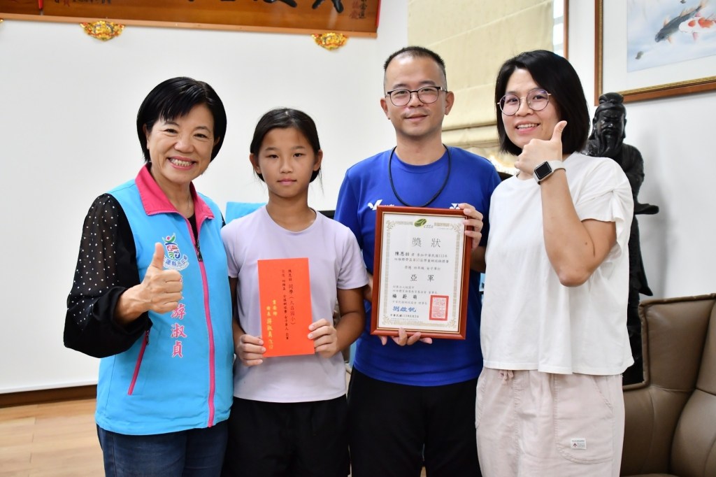 陳恩喆在父母親的陪同下特別將這面全國亞軍獎狀,分享給鄉長媽媽游淑貞,與鄉長共同擁有這份用汗水堆積、勤奮磨練的榮耀,欣喜萬分的游鄉長自掏腰包再加碼頒贈獎勵金鼓勵恩喆,並感謝父母長期陪伴學習、太昌國小師長培育多元藝能用心,讓每一位孩子們都能獲得特殊專長和興趣選項的多元能力。
