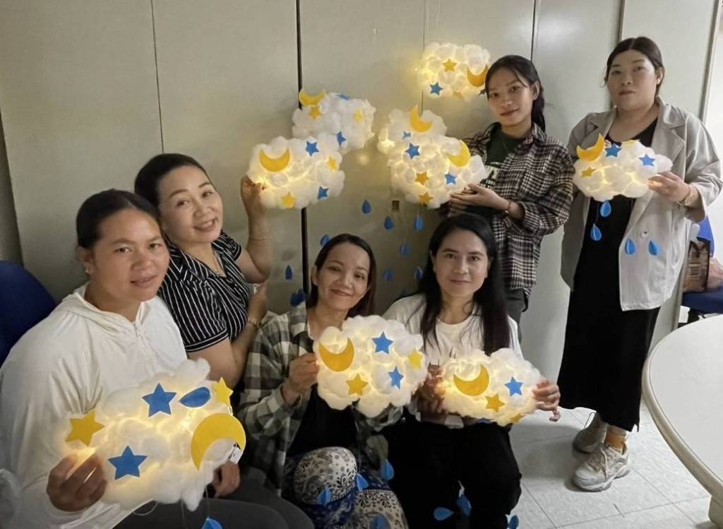 講師施慧凌創想手作雲朵燈課程,教導新住民學員以棉花、針線、膠水、燈泡及燈架等材料來製作,然而雲朵燈的形式不拘,學員可以按照自己喜愛的風格造型,創作出獨一無二的藝術燈具;施講師特別表示,雲朵燈除了外型新穎美觀之外,更具有希望與光明之象徵意義,象徵著在黑暗中點亮明燈,做自己的光驅散黑暗,迎接光明的未來。本次新住民家庭教育課程,現代婦女基金會更派員前來,向現場新住民學員宣導勇敢拒絕家庭暴力,應選擇成熟的發洩方式去與生活和解,不要停止創造價值等。在學習課程結束後,學員們無不收穫滿滿,讓歸途的行囊滿溢,內心亦充滿正能量。