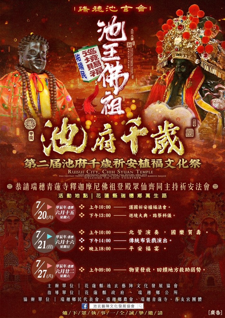 花蓮縣池玄藝陣文化發展協會將於本(7)月20日起二天,於瑞穗鄉舉辦池府千歲祈安植福文化祭,邀請各界長官、貴賓、信眾及恭請各宮堂、會館、仙佛、陣頭 交陪境 敬冗蒞會參與盛會,共沐神恩。