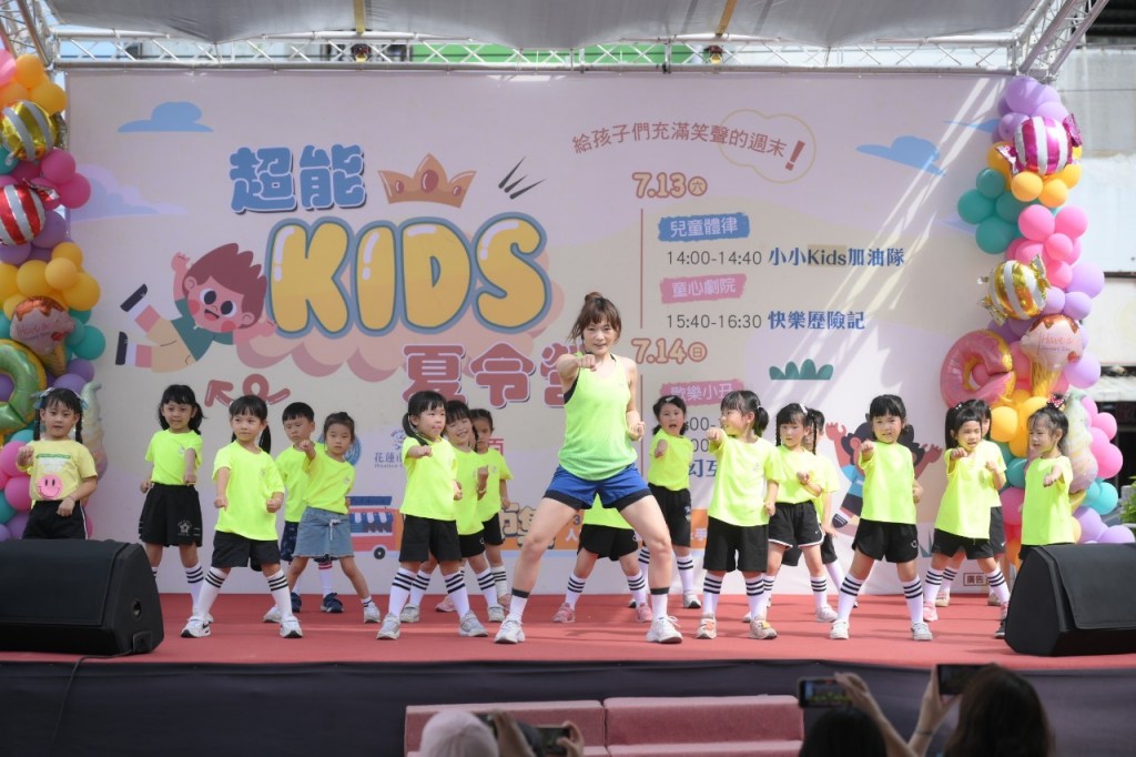 活動開場由花蓮市立幼兒園帶來氣勢十足的拳擊舞及熱血應援歌曲,孩子們在暑假期間仍抽出時間與同學們一起練習動作、整齊劃一的舞姿展現完美的成果與滿滿的活力,而台下的小朋友也跟著音樂蹦蹦跳跳,展現滿滿的熱情。