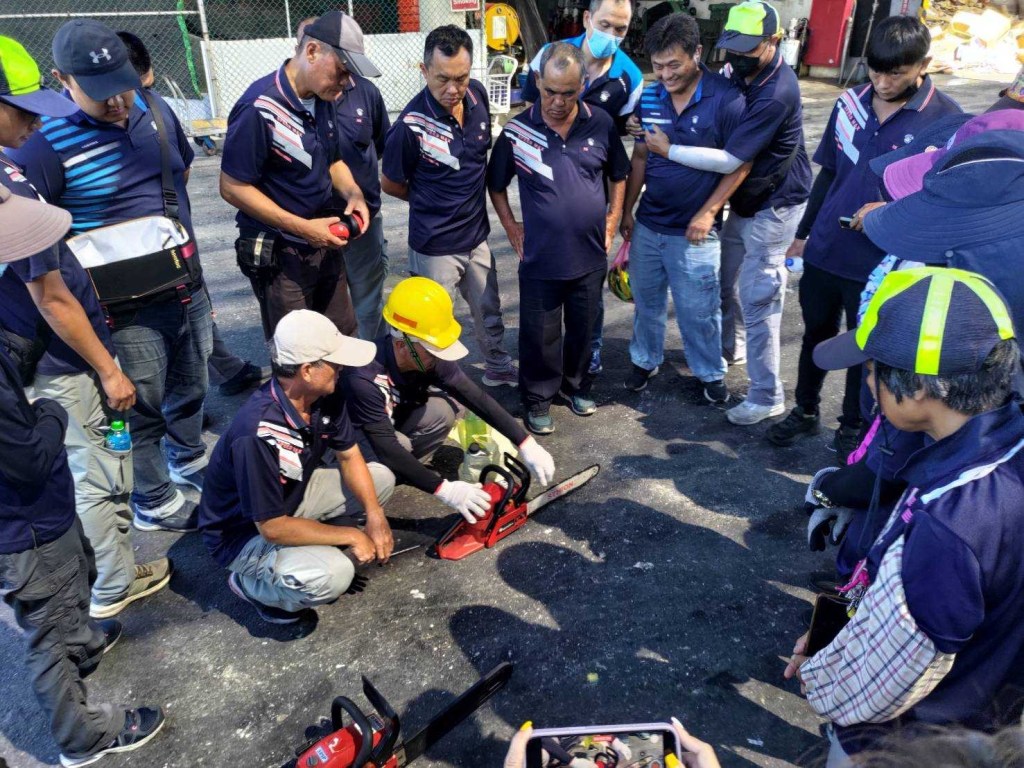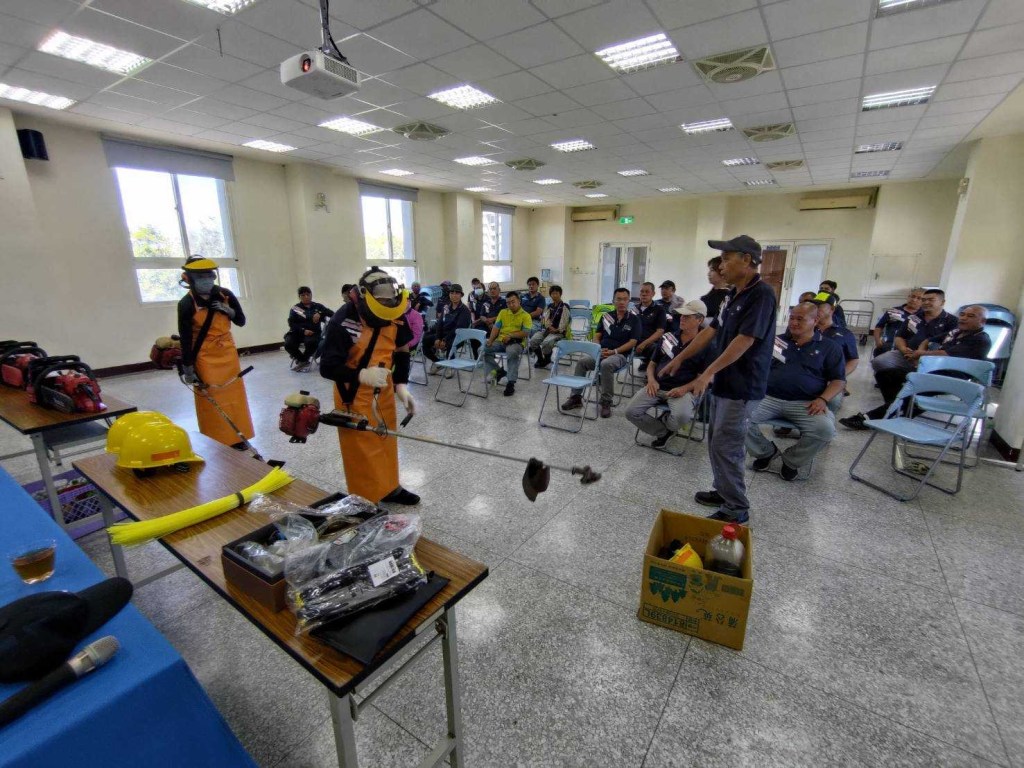 本次教育訓練以比較常使用的鏈鋸及割草機作為訓練科目,由隊部中具有實務經驗的隊員擔任教官,除了教導機具實際操作要領外,並由保養廠廠長講解機具保養方法及簡易的故障排除。此外,清潔隊也已規劃在8月份針對災後環境整頓及淹水地區的災後環境消毒,進行各項環境消毒器材操作教育訓練。