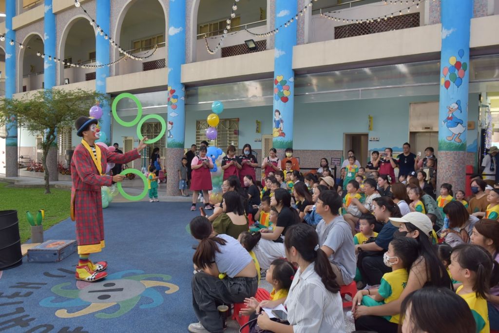 緊接著市幼安排小丑「哈哈先生」帶來的默劇互動表演,不僅有精彩的特技演出,還與孩子跟家長進行舞台互動,讓大家都捧腹大笑;接著登場的是孩子最期待的泡泡派對,新生們陸續體驗各種泡吹泡泡的裝置,七彩的泡泡在陽光下飛舞,小朋友們都忍不住歡呼並追趕著泡沫。
