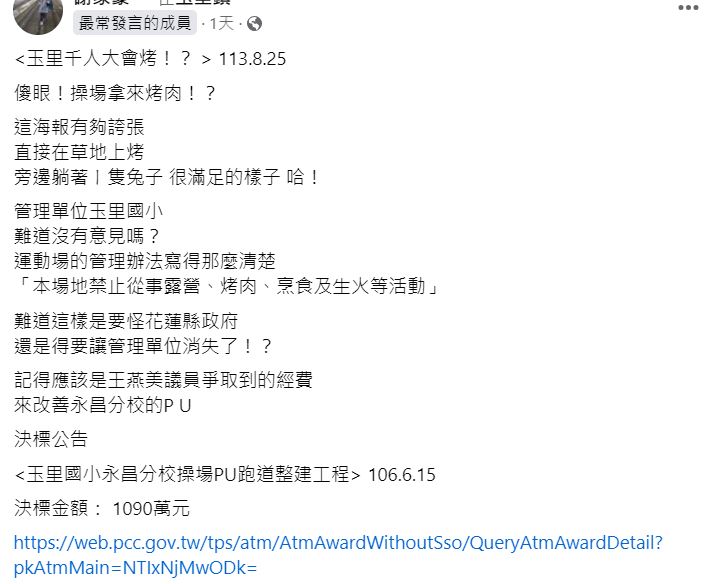 發文者文章一開頭就說:「傻眼!操場拿來烤肉!?」主張運動場地使用須知告示牌寫明「本場地禁止從事露營、烤肉、烹食及生火等活動」。並表示玉里國小永昌分校的P U 跑道是縣議員爭取1200餘萬元於106年改善的,意指烤肉活動將可能造成破壞。