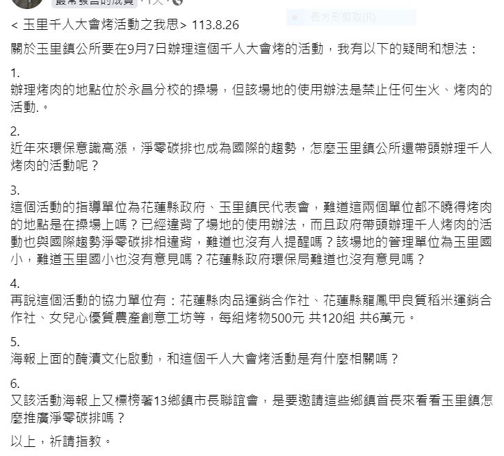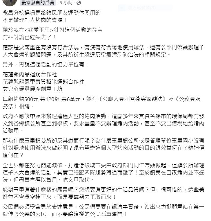 日前玉里鎮公所發布活動預告,將於9月7日舉辦「玉里醃漬節啟動-千人大會烤」活動,而有民眾於網路社群平台發表多篇言論,質疑活動場地違法使用、鎮長龔文俊有圖利之嫌,引起網民爭論。