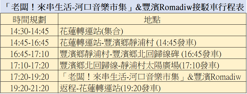【豐濱Romadiw」x「老闆!來串生活」河口音樂市集】接駁時程規劃(時間為預估,視實際情況調整)