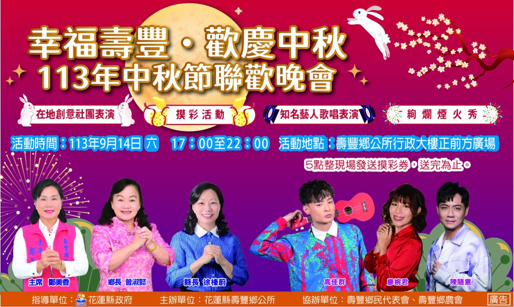 壽豐鄉公所提前在九月十四日晚上五點舉辦中秋聯歡晚會,除了安排壽豐鄉知名社團獻藝,還有上百項摸彩品、煙火秀、胖卡專車美食提供,晚會特別邀請到有廚師、演員、歌手三重身分的陳隨意、還有有著小詹雅雯稱號的廖婉君以及超級紅人榜偶像組衛冕者,被臺語歌手詹雅雯譽為凍憨歌王的高佳群登台獻藝