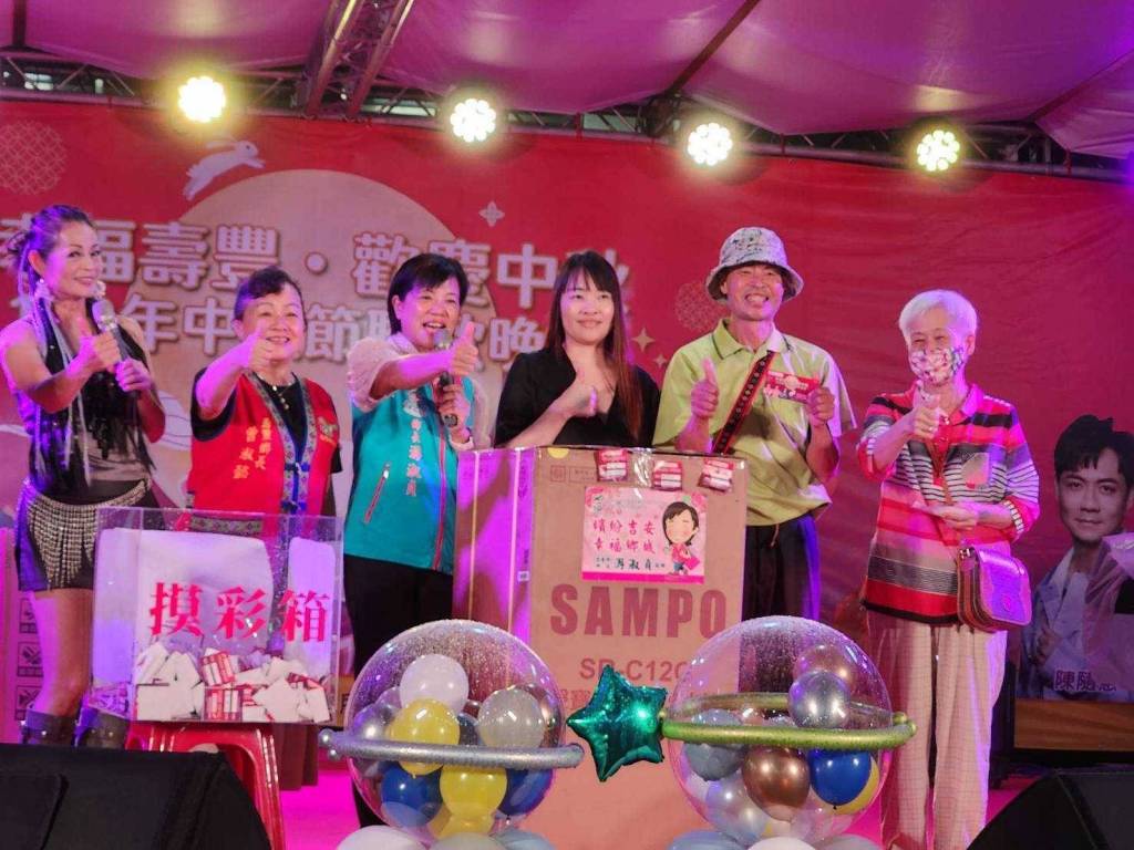 壽豐鄉公所舉辦中秋晚會,雖然大雨來攪局,但豐富摸彩品與全國知名歌手陳隨意、廖婉君、高佳群登台獻藝,上千名鄉親雨中相挺,鄉長曾淑懿感謝壽豐鄉親支持,她與夫婿劉耀宗一人當選兩人服務,一日當兩日用努力建設福利壽豐,未來將爭取更多經費與資源,率領公所團隊為壽豐鄉親打造幸福家園。