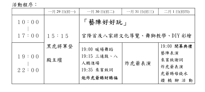 花蓮縣黑虎將軍技藝文化交流協會理事長楊金明表示,今114年大年初二至初四於玉里圓環將辦理連續3日的活動,日間「藝陣好好玩」活動有家將的文化導覽、舞獅弄姿及DIY彩繪,將揭開神祕的家將典故,非常適合親子一同參與,重頭戲是於大年初四晚間七時安排有家將及將首藝陣表演、鑽轎底活動、領取虎爺母錢水等,歡迎鄉親共襄盛舉。