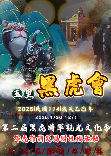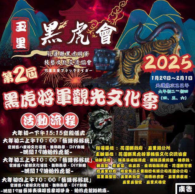 去113年由花蓮縣黑虎將軍技藝文化交流協會於玉里圓環所舉辦的「第一屆黑虎將軍觀光文化季」讓花蓮縣南區玉里鎮過年期間創造新亮點。而今114年花蓮縣黑虎將軍技藝文化交流協會更是擴大舉辦,將於1月30至2月1日大年初二至初四舉行「第二屆黑虎將軍觀光文化季」暨「藝陣好好玩」系列活動。主辦單位表示今年將舉辦連續三天炮炸虎爺活動1/30至2/1晚間7時開始連續三天將有不一樣的陣頭表演。