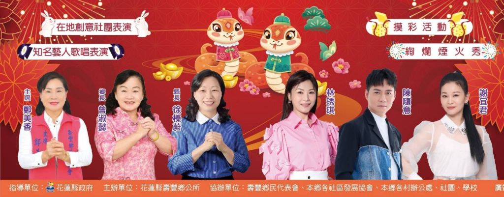 壽豐鄉公所提前2月8日星期六下午五點在壽豐鄉全民廣場舉辦114年壽豐鄉元宵晚會,鄉長曾淑懿感謝鄉親支持,晚會邀請到影歌雙棲「總鋪師歌王」陳隨意、豪記唱片知名歌星謝宜君、超級紅人榜知名歌手林琇琪,以及在地社團帶來精彩表演,曾淑懿歡迎鄉親闔家到場歡慶元宵。