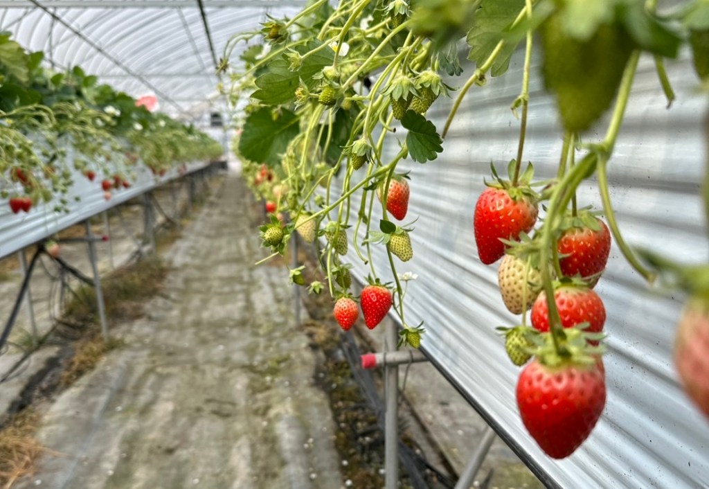 「草莓屋天空農場」以高架栽培技術 為特色,讓草莓在架高的種植環境中生長,不僅能避免病蟲害,提高產量與品質,也能讓農民減少彎腰作業的負擔。此外,這座農場還導入智慧監控系統,透過 AI 來調控溫度、濕度與養分,確保草莓在最適合的環境中生長。