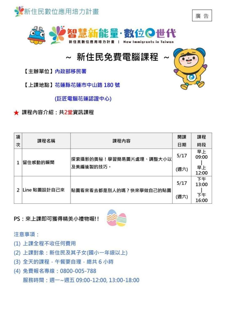 花蓮縣服務站胡朝仁表示,移民署持續關注新住民在臺灣的發展,並鼓勵他們運用自身專長融入社會,透過多元文化的交流,讓臺灣社會更加包容與豐富;此外,由移民署主辦的「新住民免費電腦課程」,目前於114年5月17日(六)巨匠電腦花蓮認證中心(花蓮市中山路180號)確定開課囉!透過電腦學習課程,有助於提升新住民朋友及新二代的資訊應用能力,豐富生活並運用於工作上。歡迎各位新住民朋友偕同子女一同來學習電腦,不僅費用免費,來上課還可以獲得精美小禮物!如有相關電腦課程問題歡迎撥打免費報名專線:0800-005-788洽詢。