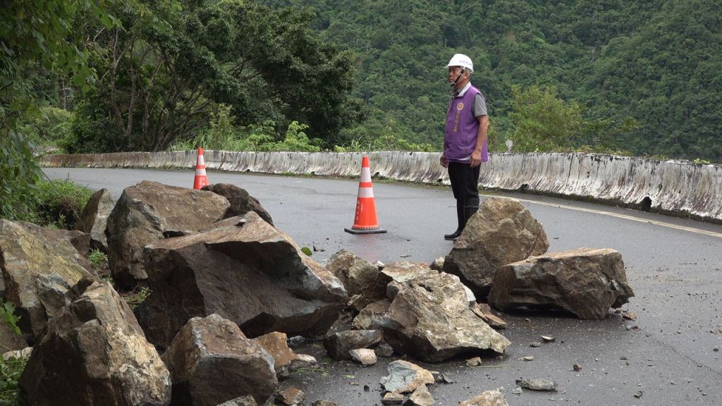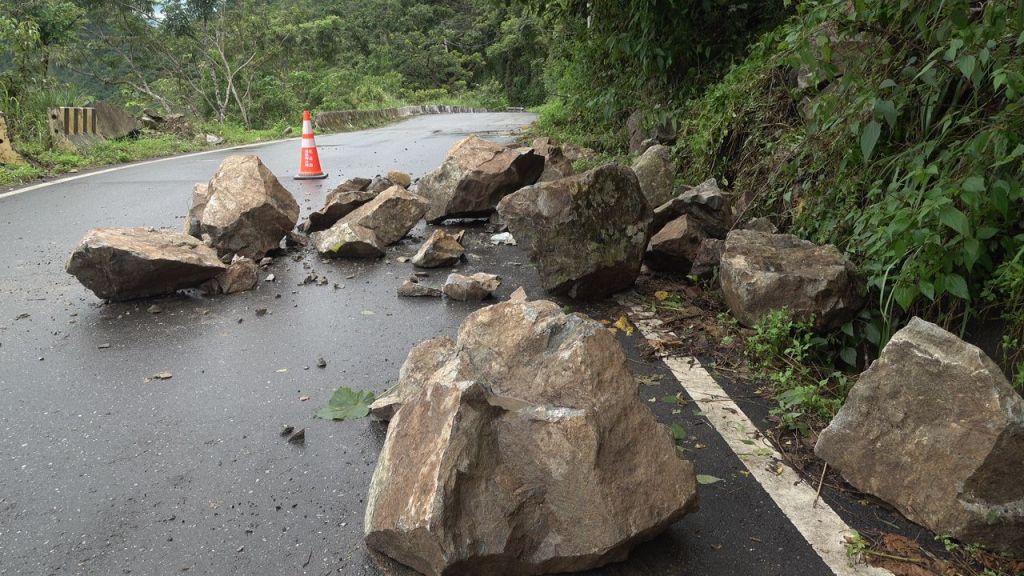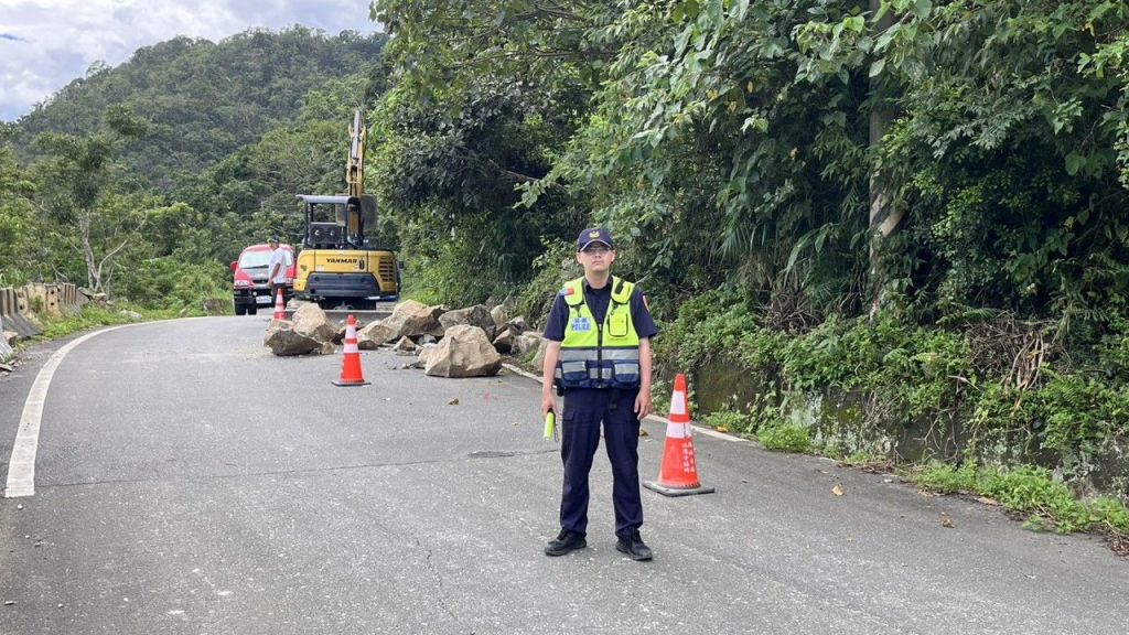 6/13上午10時巡視轄區道路狀況時,在花64線瑞港公路19公里處發現邊坡坍方有數塊大型落石滾落路面,佔據半個車道影響行車安全,警方隨即於現場實施交通管制,放置三角錐警示人、車注意通行,並通報瑞穗鄉公所相關單位到場排除。