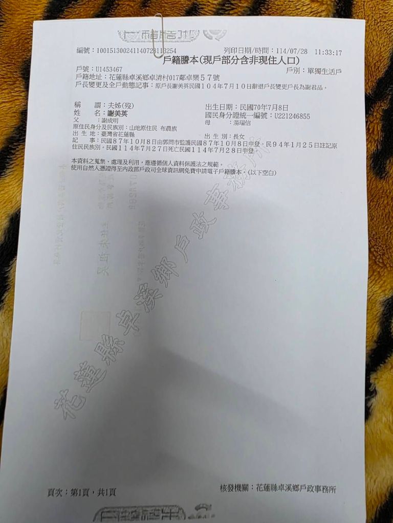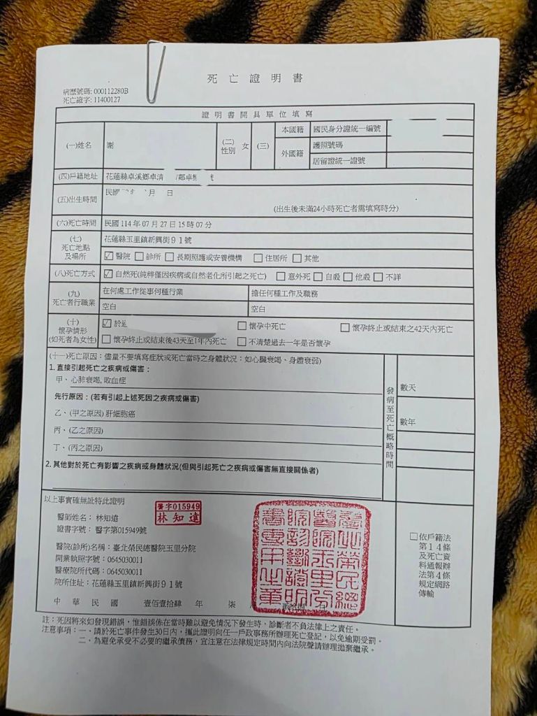 自此,她展開了漫長的治療過程。無奈癌細胞擴散迅速,終究在114年7月27日15時07分,因肝癌併發心肺衰竭及敗血症,結束了她短暫而充滿意義的44年人生。她的離去,讓部落中的每一個人都感到無比不捨與惋惜,彷彿那道溫暖的光芒就此黯淡。