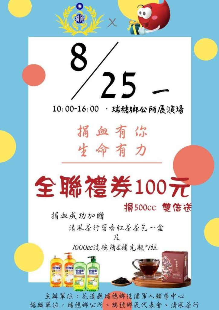 近期受到天氣不穩影響,連帶影響捐血人數,花蓮捐血中心庫存O型血液庫存偏低。為緩解用血壓力,瑞穗鄉鄉長吳萬德與後備軍人輔導會,今(25)日共同號召地方社團與瑞穗鄉親共同參與「捐血有你、生命有力」公益捐血活動,全力協助提升血庫存量,共同響應一袋熱血、一份希望、助人益己的善舉。
